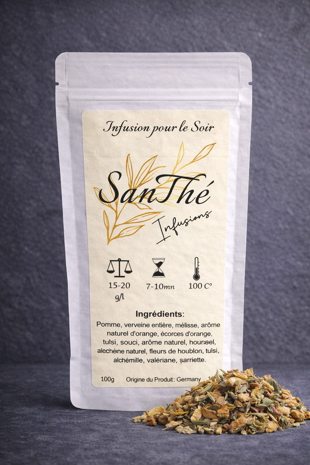 Treat yourself to a soothing and comforting break with our Evening Infusion , a premium blend carefully crafted from sustainably sourced ingredients. This smooth and harmonious infusion combines the fruity flavors of apple and natural orange aromas, perfectly balanced by citrus notes from orange peel.