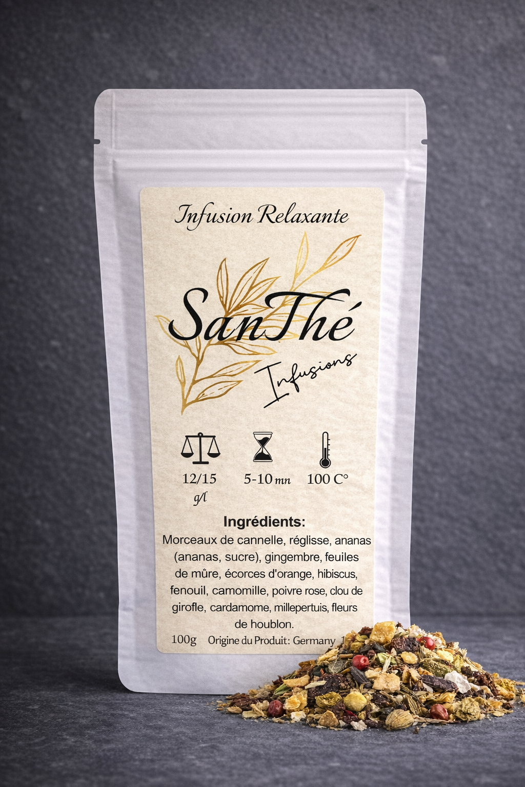 The relaxing infusion is much more than just a drink: it is a real invitation to relaxation and well-being. Composed of carefully selected ingredients, this infusion offers a unique taste experience while promoting relaxation.