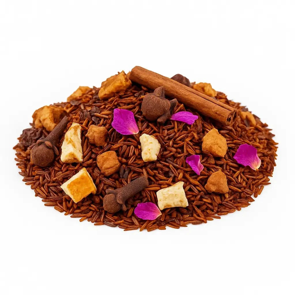 Notre thé de Noël est une création chaleureuse qui célèbre les saveurs traditionnelles des fêtes. Ce thé de Noël associe la douceur du rooibos naturel à la gourmandise de la pomme et aux notes zestées des écorces d’orange relevées d’un arôme naturel d’orange. Les épices emblématiques de ce thé de Noël, comme les bâtons de cannelle, le clou de girofle et la cardamome, apportent une intensité parfumée et réconfortante. Les délicats pétales de rose ajoutent une touche florale raffinée, sublimée par un arôme naturel soigneusement choisi. Préparé avec des ingrédients issus de l’agriculture durable et des arômes naturels, ce thé de Noël premium séduit par son équilibre entre douceur fruitée et chaleur épicée. Idéal pour créer une atmosphère conviviale en hiver, ce thé de Noël sans théine se savoure à tout moment de la journée, pour un instant festif et gourmand.